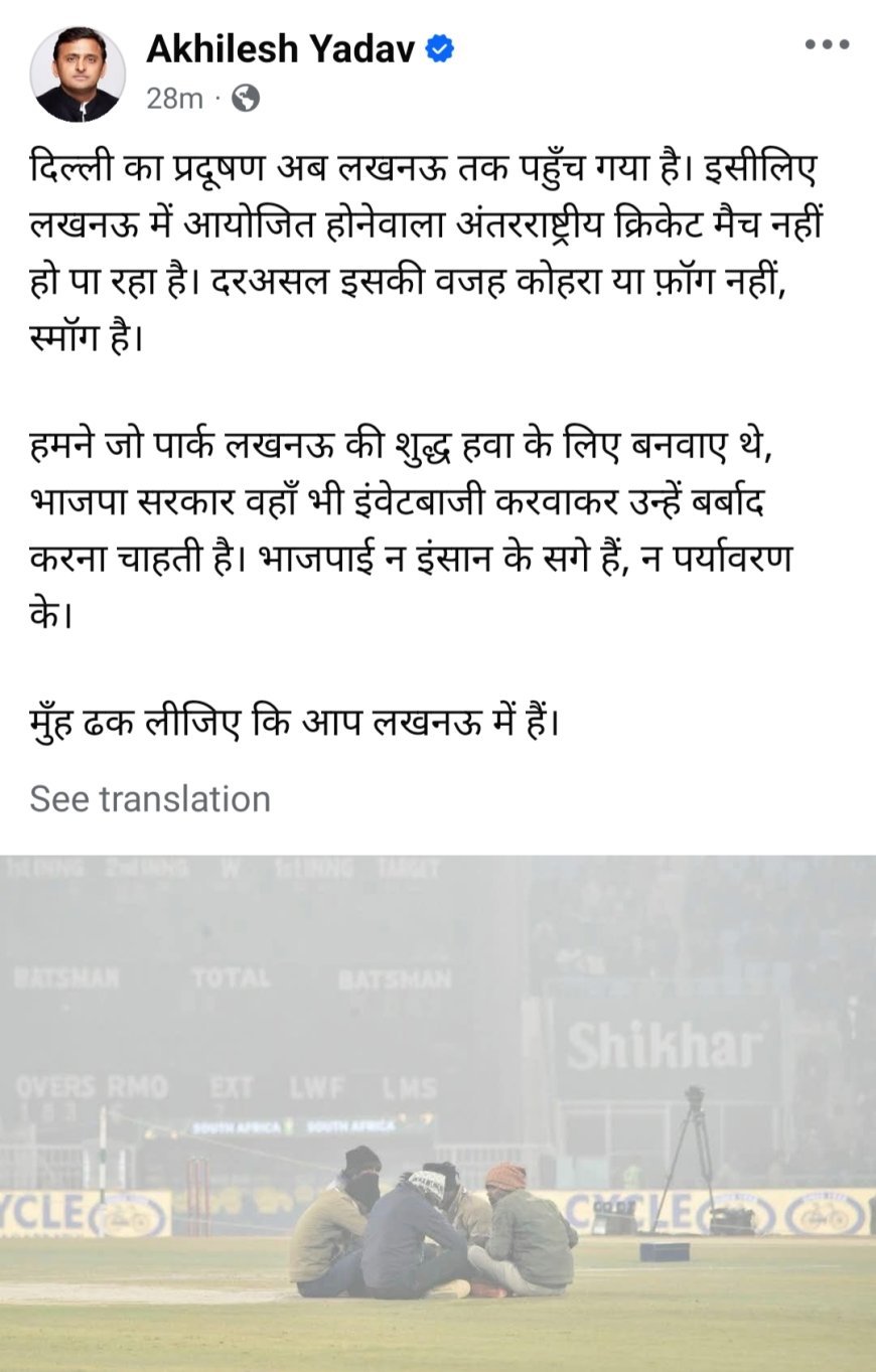 नई दिल्ली,17/12 : दिल्ली का प्रदूषण को लेके अखिलेश यादव अपना सोसिअल मिडिया पे टारगेट किया हे । लिखे हे की, दिल्ली का प्रदूषण अब लखनऊ तक पहुँच गया है । इसीलिए लखनऊ में आयोजित होनेवाला अंतरराष्ट्रीय क्रिकेट मैच नहीं हो पा रहा है। दरअसल इसकी वजह कोहरा या फ़ॉग नहीं, स्मॉग है ।